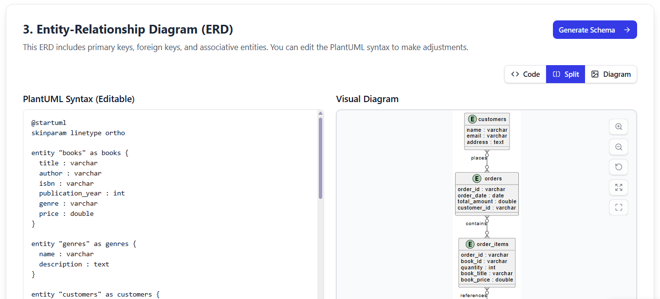 The tool automatically converts your domain model into a fully detailed Entity-Relationship Diagram (ERD), complete with: