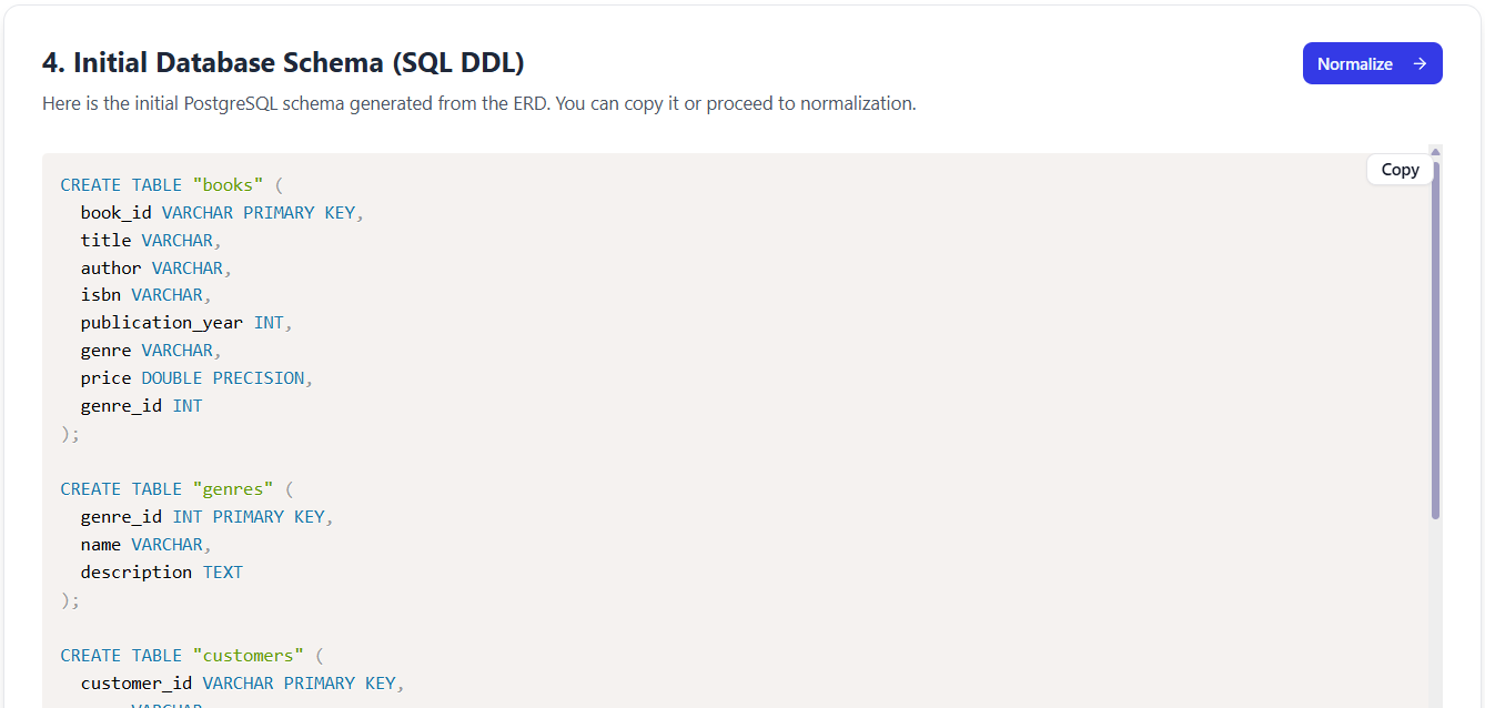 | AI-Powered Normalization | Auto-optimizes to 3NF with clear explanations |