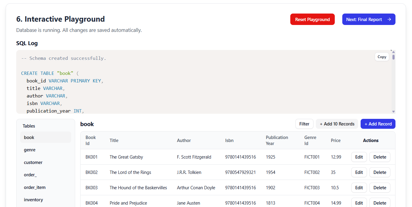 Auto-generated inserts for all tables (e.g., 5 sample books, 3 customers, 2 orders)