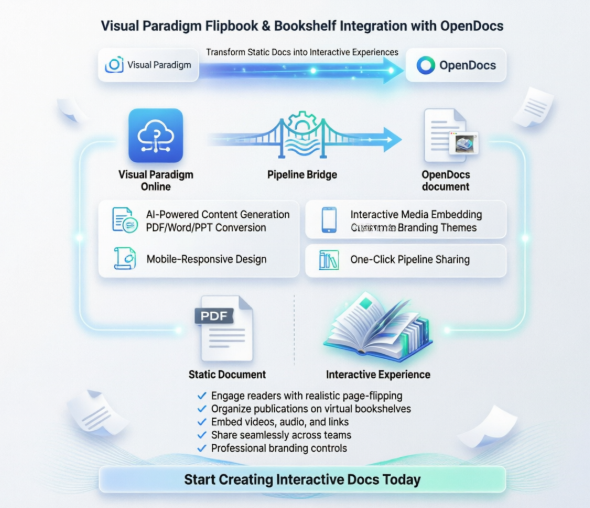 Visual Paradigm has introduced a seamless workflow that allows you to share flipbooks and digital bookshelves created in Visual Paradigm Online directly to OpenDocs. This isn’t just about embedding a viewer—it’s about creating an immersive reading experience where your audience can flip through pages, interact with multimedia content, and access curated collections of publications without ever leaving your documentation.