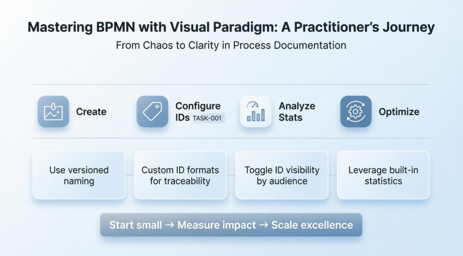The key takeaway from Johnson’s journey? Treat BPMN diagrams as living artifacts, not static deliverables. Configure IDs for traceability, leverage built-in statistics for continuous improvement, and tailor visibility settings to your audience. The flexibility Visual Paradigm offers isn’t merely convenient—it’s what transforms good process maps into catalysts for measurable business change.