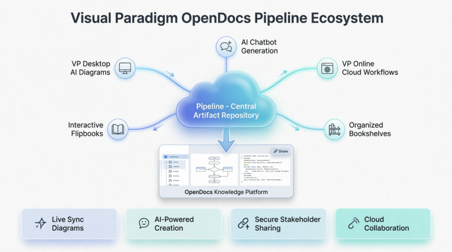 The Pipeline isn’t just marketing jargon. It’s a secure cloud repository that acts as the connective tissue between Visual Paradigm Desktop, Online, the AI Chatbot, and OpenDocs. In practice, this means: